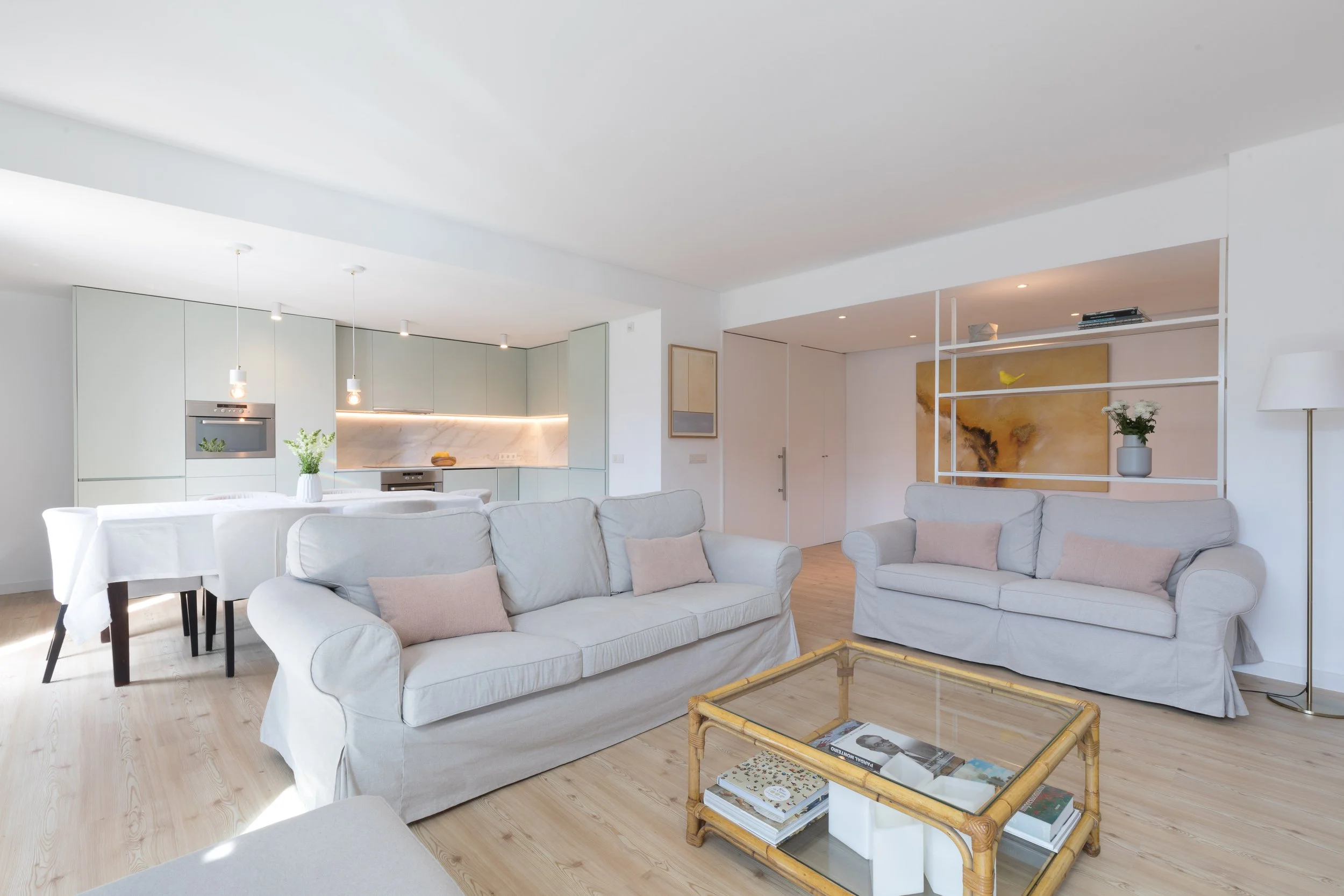 A primeira área, a zona de entrada do apartamento é agora delimitada de forma mais clara a partir da proposta de inserção de uma estante desenhada de forma a ser integrada no espaço. Este objeto, que funciona como separação clara até ao teto com uma cota inferior na zona de entrada, permite ao mesmo tempo manter uma relação visual com o resto do espaço e manter a iluminação natural na zona de entrada. A segunda zona, é a zona de estar que se demarca das restantes devido à estrutura original dos vãos exteriores e ao pé direito mais elevado. A cozinha, agora integrada na sala, é proposta por isso como um objeto de destaque que ao conviver com a restante área social, tem um grande impacto no mesmo. Nesse sentido, ao propor a sua relocalização, o seu desenho foi pensado de forma a ser um objeto que se integrasse na restante área social, não só ao nível da distribuição dos equipamentos, mas principalmente ao nível da cor e materiais escolhidos. A zona de refeições é agora possível de integrar no espaço de uma forma funcional e demarca-se pela iluminação de teto proposta. Foi proposta ainda a alteração do pavimento de toda a zona social, bem como a lacagem de todas as madeiras existentes no espaço, de forma a torna-lo mais amplo.